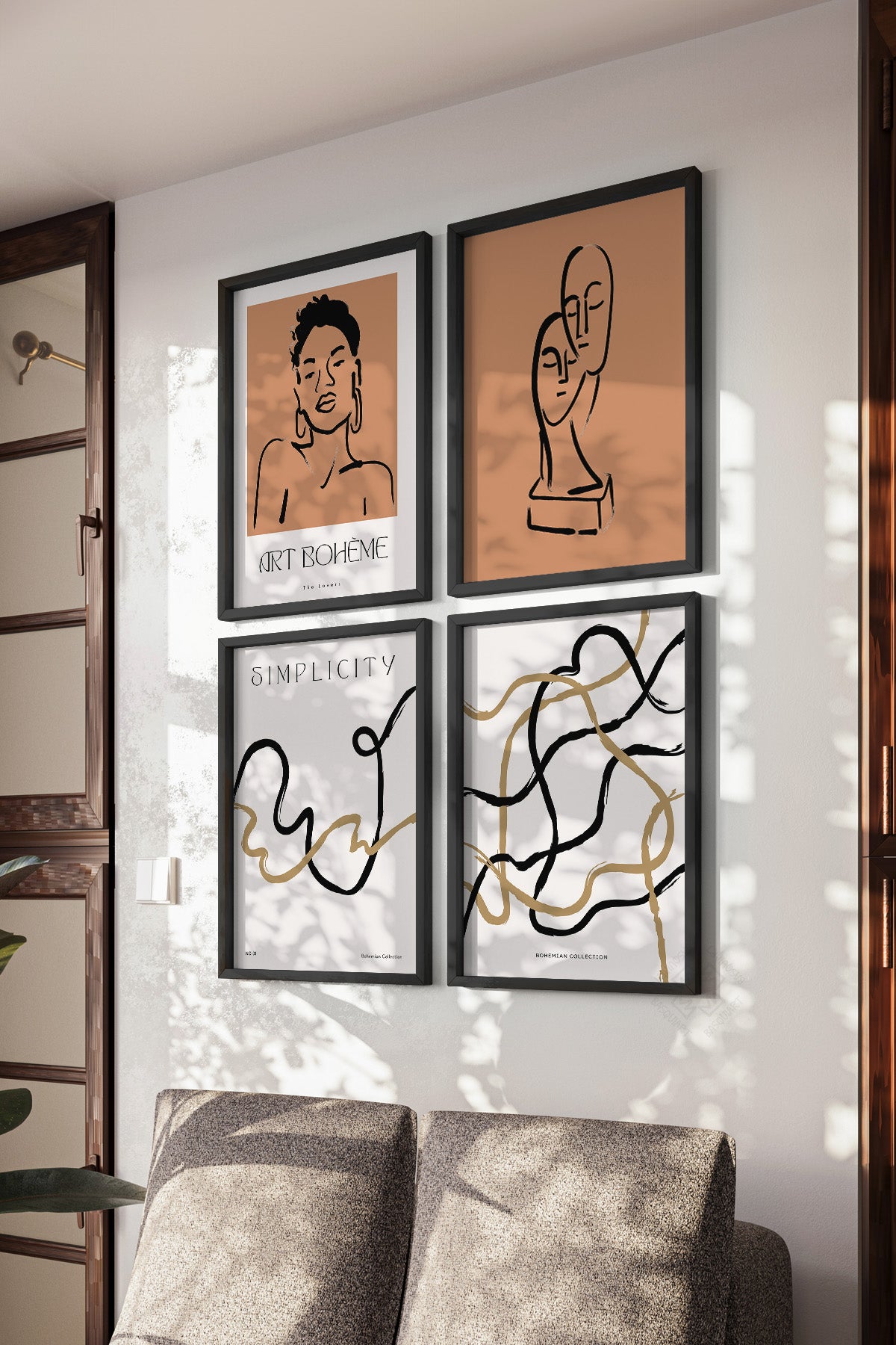Çizgisel Bohem 4'lü Ahşap Çerçeveli Poster, Tablo Seti No:11